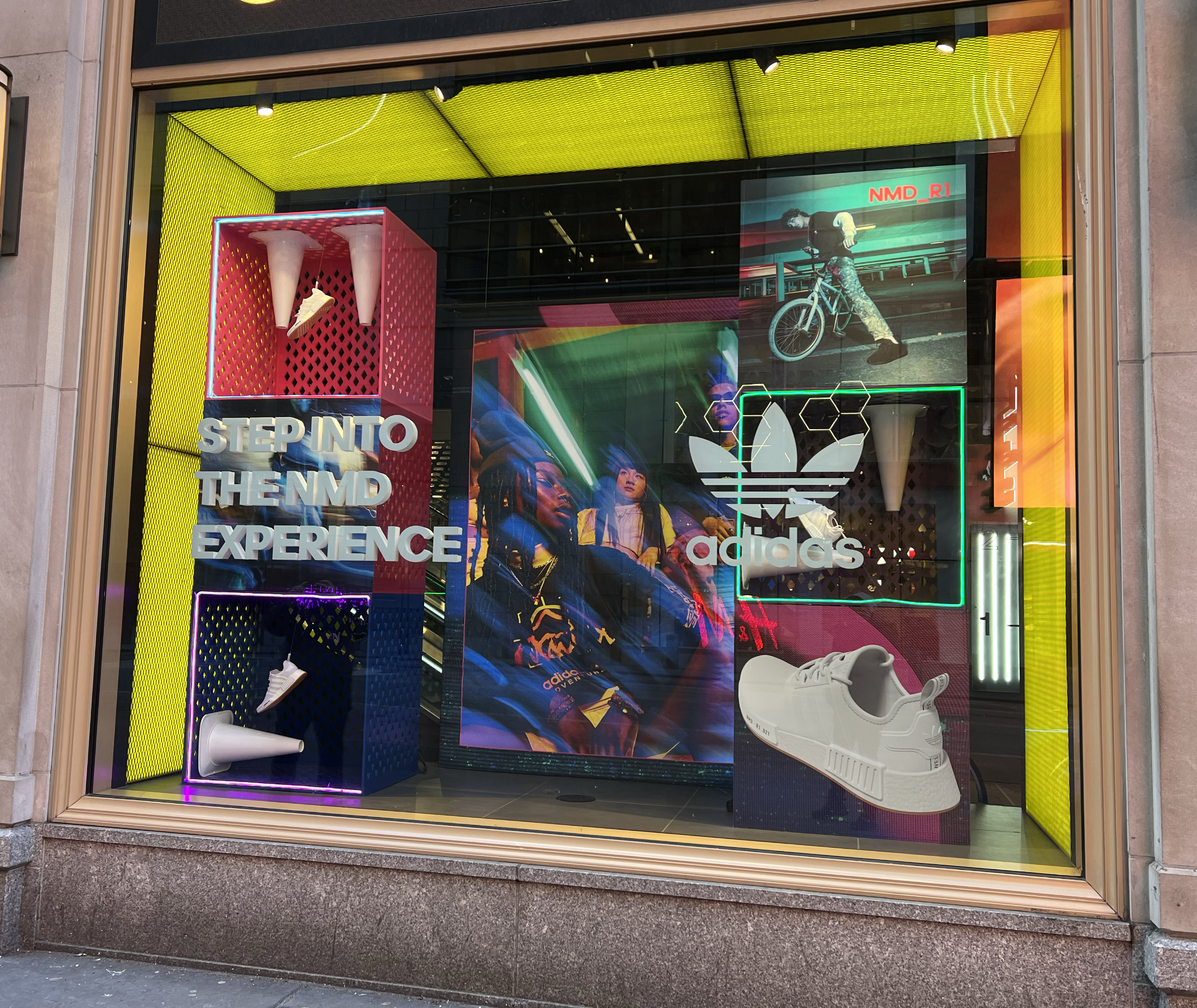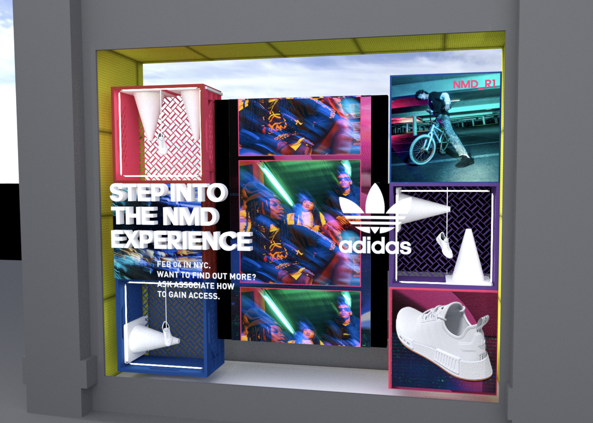 To hype up the event, Adidas requested a window display design and print & digital campaign that would relate directly to the urban discovery energy of the event. We brought the city inside with oversized milk crates, traffic cones, and LED lighting while integrating the NMD shoes into the display.